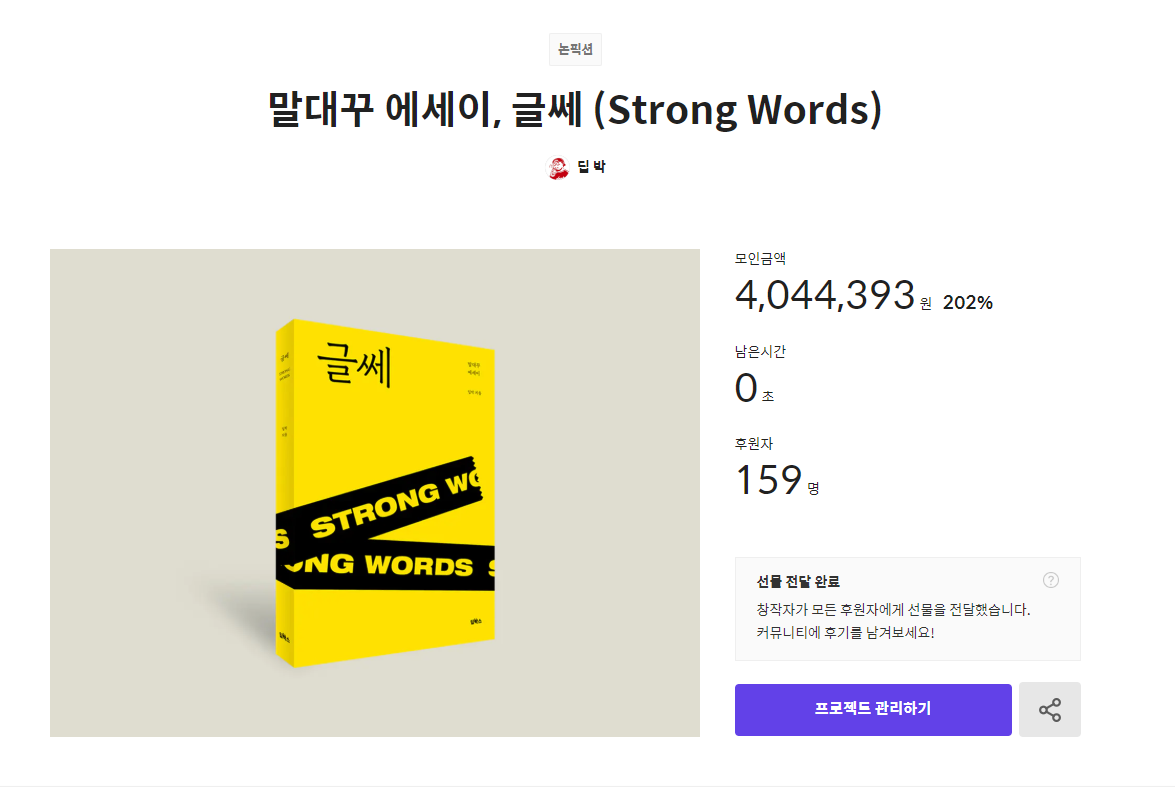 - 펀딩 기간 동안 (평균 30일 이상), 인쇄소, 책 내지 디자인, 마지막 퇴고 작업, 사전 입고 문의 등