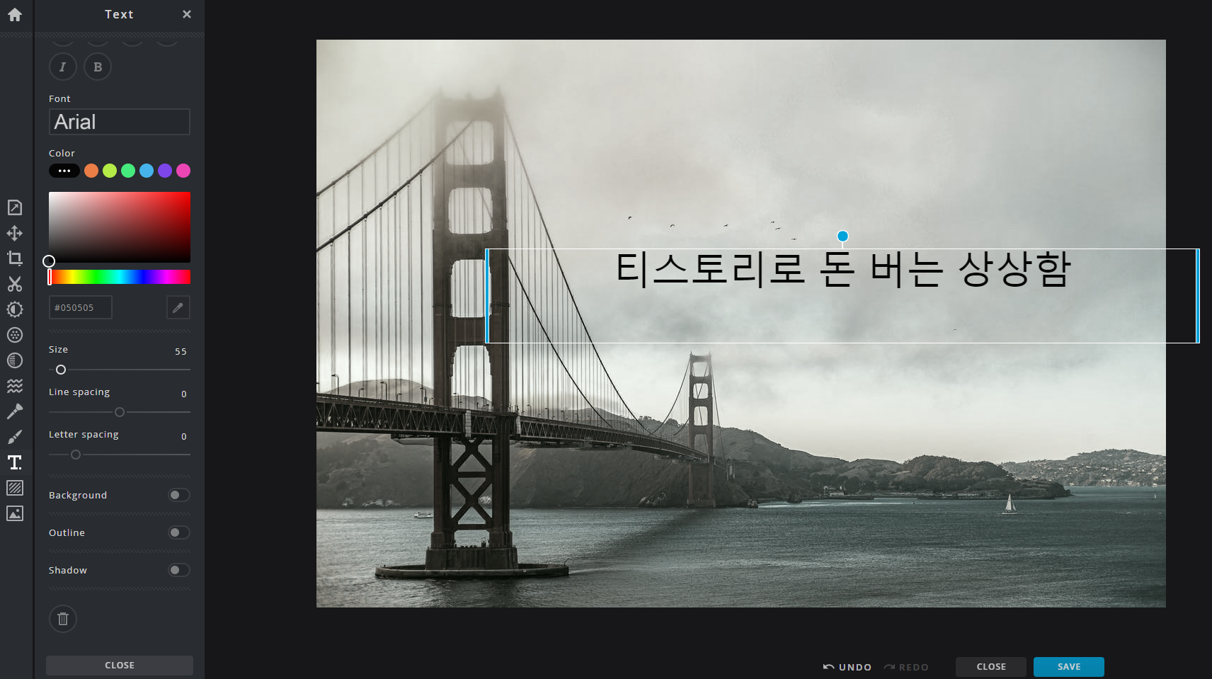 Text 툴을 사용하시면 글자 사이즈 조절, 컬러 조절, 아웃라인 색깔 조절, 자간 조절 등 모든 편집 기능을 다 활용하실 수 있습니다.