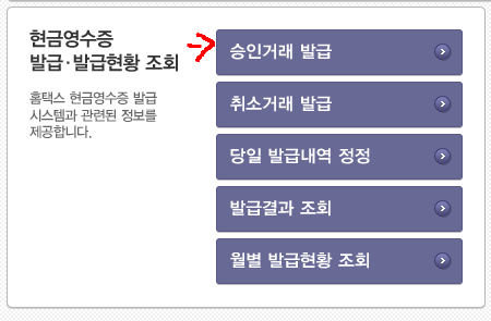 1. 홈텍스 홈페이지 접속 - 조회/발급 - 현금영수증 - 현금영수증 발급